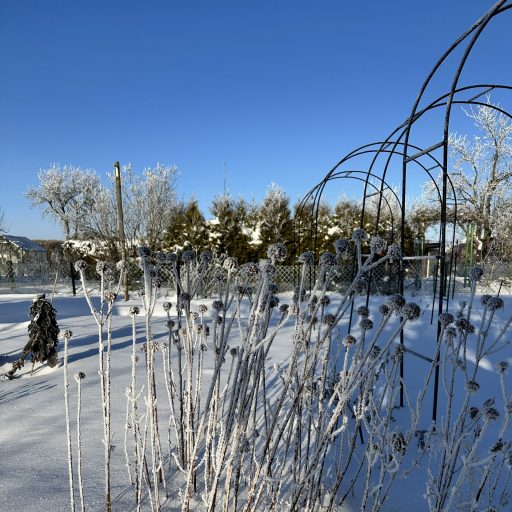 Zwischen den verbliebenen Staudenständen finde ich noch Samen. Die trockenen Blütenköpfe ragen wie kleine Türme aus dem Schnee. Ein gedeckter Tisch für Vögel wie mich. Ihr habt sie stehen lassen. Gut so. Der Garten vergisst seine Freunde nicht.